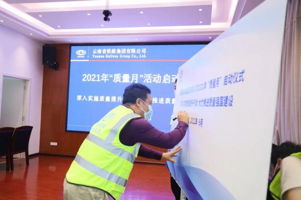 啟動(dòng)儀式現(xiàn)場,云鐵集團(tuán)黨委副書記、董事長童秀東鄭重宣布活動(dòng)啟動(dòng)。隨后,公司領(lǐng)導(dǎo)班子成員帶頭,干部職工依次在“質(zhì)量月”活動(dòng)主題板簽名。