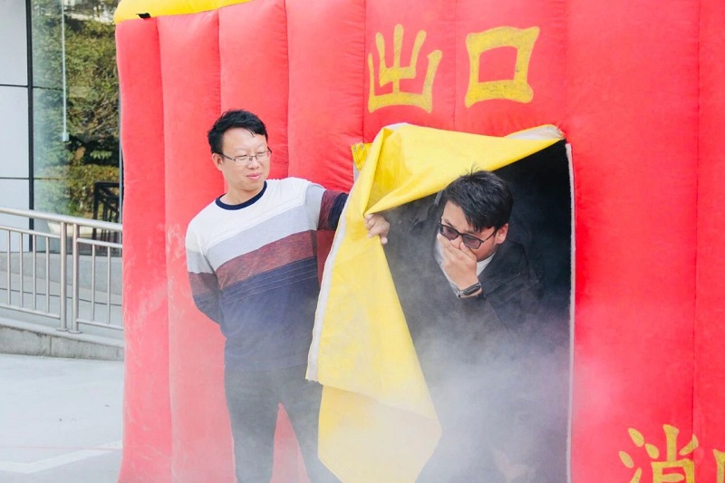 大家學習了滅火器具的使用方法:提、搖、拔、瞄、噴,分組使用滅火器進行現(xiàn)場滅火。隨后,5人一組進行模擬火災(zāi)現(xiàn)場逃生。